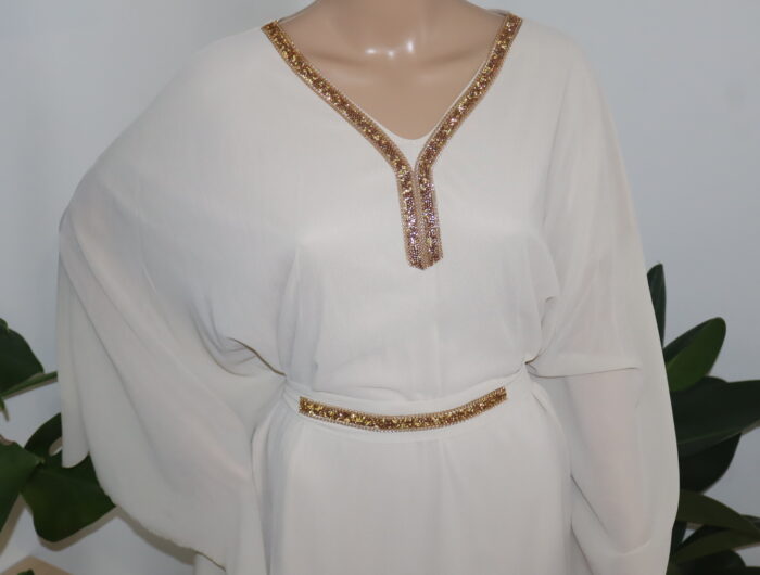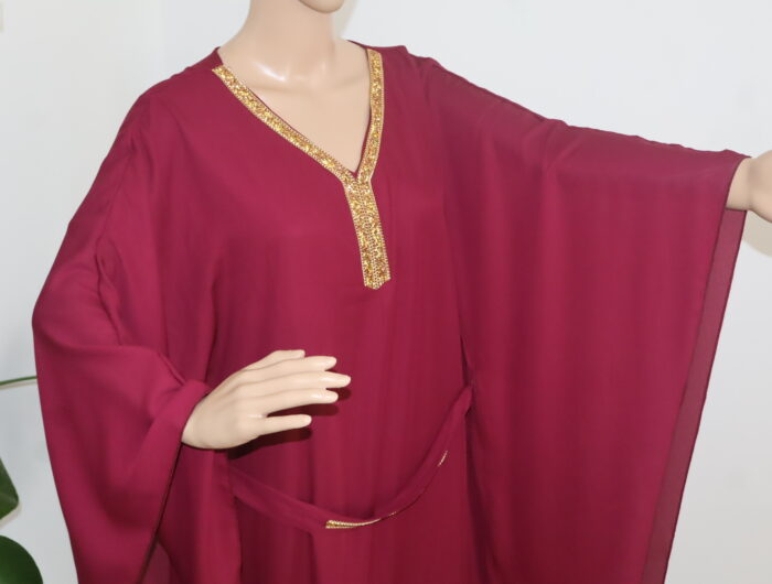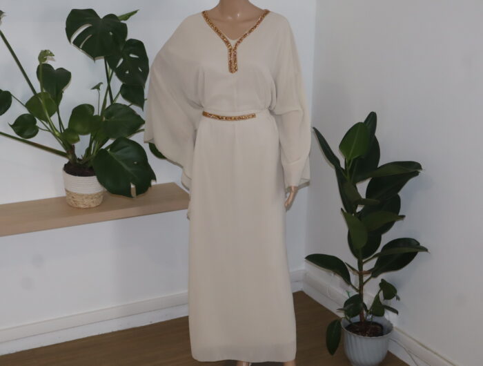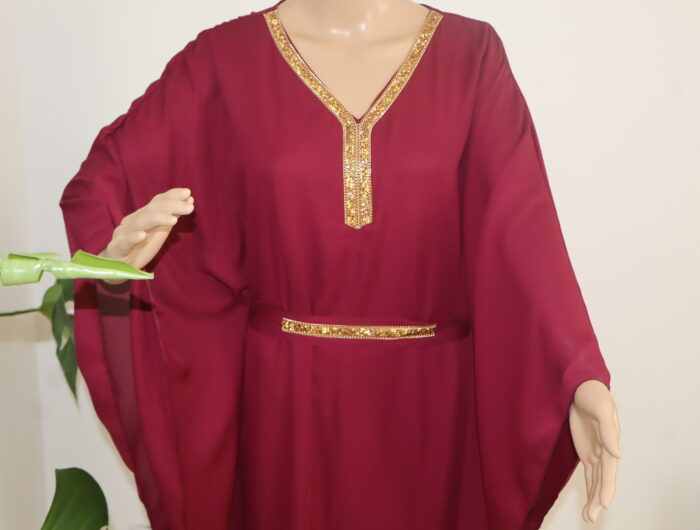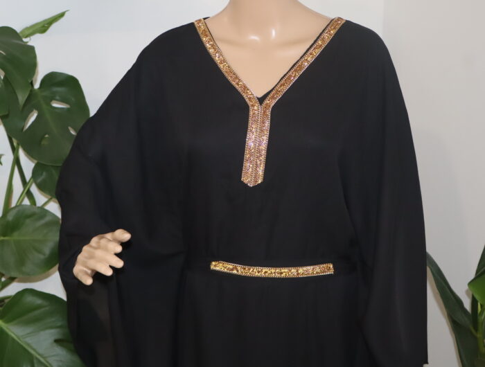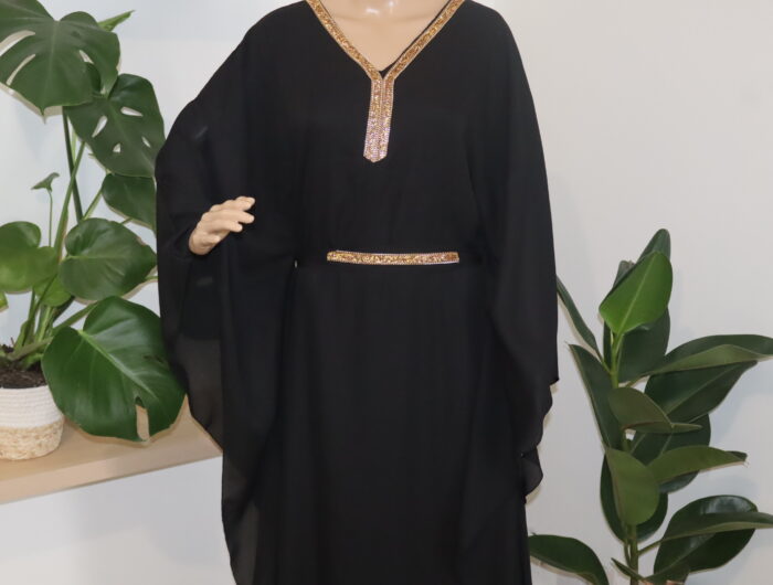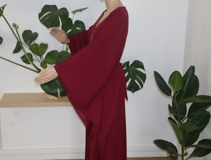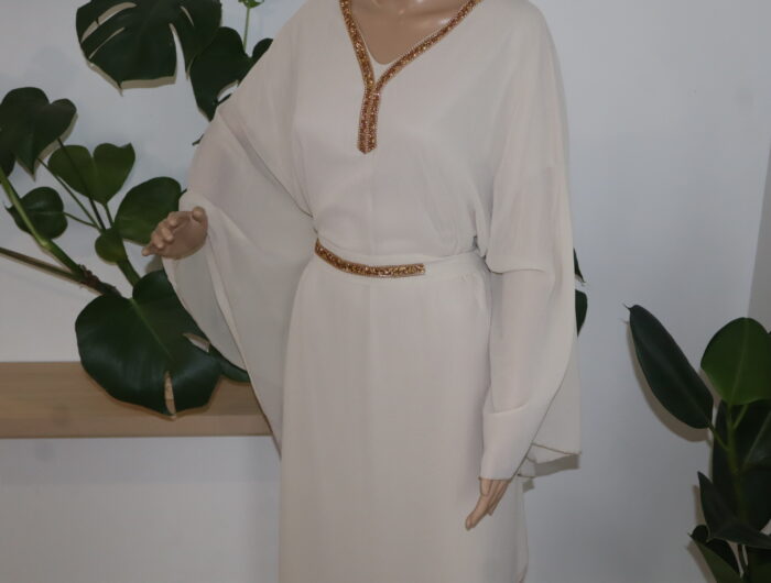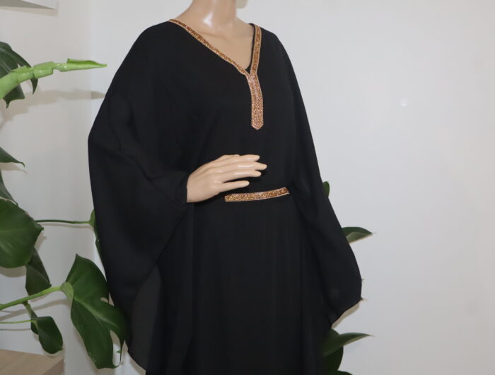 - La robe abaya longue est une pièce iconique alliant élégance et sophistication. Agrémentée d’une ceinture délicate et d’une dentelle dorée subtile qui se déploie avec grâce le long du col, elle incarne à la perfection l’harmonie entre tradition et modernité. Cette tenue raffinée saura sublimer la silhouette et apporter une touche de glamour à toute occasion.